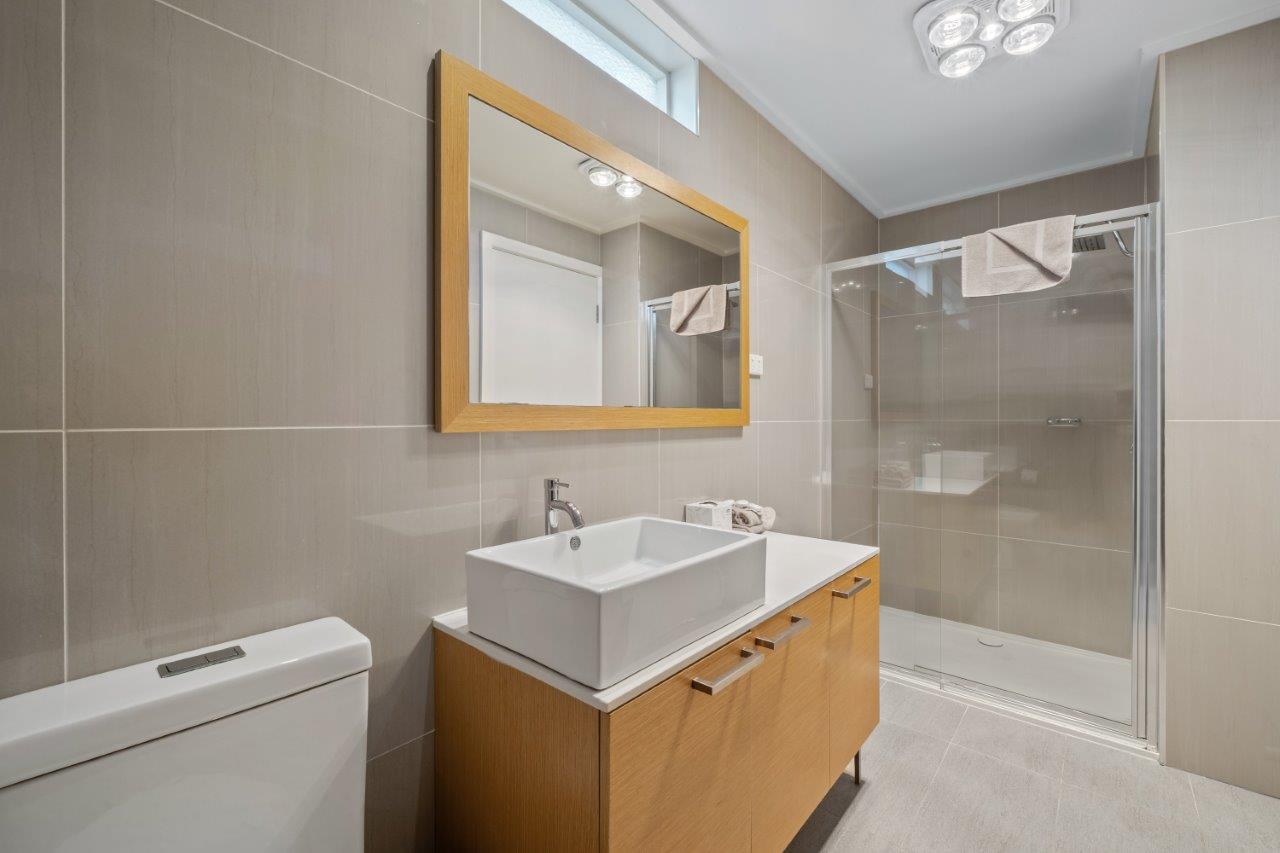 Refresh in the renovated bathroom with a rain shower and marble vanity.